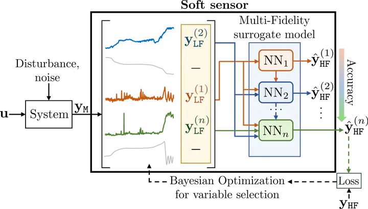 Soft sensors, or inferential sensors, are crucial in quality and process control systems because they allow for e!cient, online estimation of essential quantities that are otherwise di!cult or expensive to measure directly. In many applications, it is common to use cost-effective measurement equipment, offering faster data collection than high-fidelity measurements, albeit at the price of reduced accuracy. These low-fidelity data can provide useful information to enhance the estimation of output quantities of interest, thereby facilitating the design of inferential control systems. In this work, we introduce an innovative approach to soft sensing by employing hierarchical, multi-fidelity surrogate models as soft sensors, integrated with Bayesian optimization for input variable selection. Our method creates a parsimonious model by identifying and organizing relevant inputs into a fidelity hierarchy, which enables a multi-fidelity neural network to sequentially refine estimations by extracting crucial information progressively. First, we showcase the e”ectiveness of the proposed framework on a numerical benchmark, then we use our method to create a surrogate model as soft sensor for accurately determining the atmospheric particulate matter concentration (PM2.5) using real data collected from low-cost sensors.